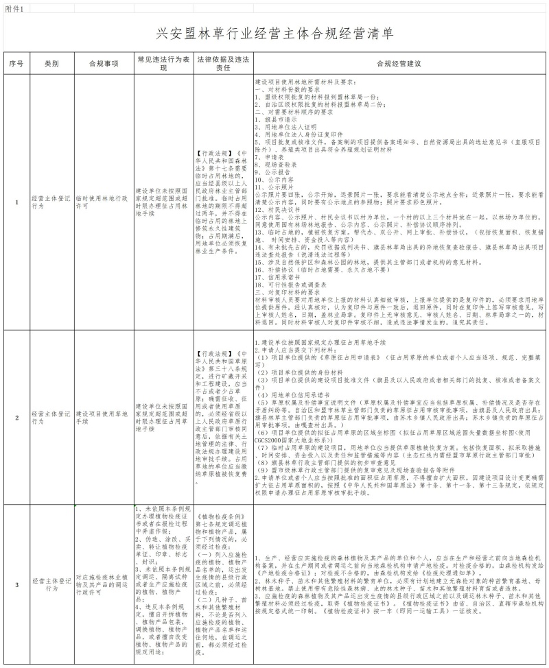 结合当前优化营商环境的要求,建立林草行业市场主体“一业一册”合规经营指南,清单式告知市场主体合规经营要求和失信行为,指导市场主体完善内控管理机制、风险响应机制,减轻市场主体负担,增强市场主体的信用意识和自我约束力,营造公平竞争、规范有序的市场环境,切实优化提升我盟营商环境。