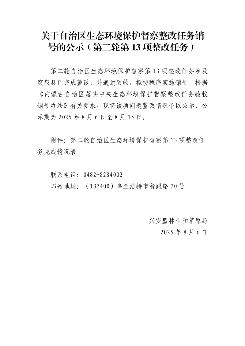 关于自治区生态环境保护督察整改任务销号的公示(第二轮第13项整改任务)