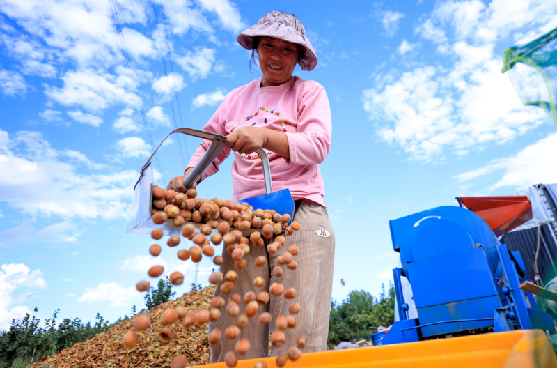 晾晒场上,工人们正忙着翻动新采收的果实。晾干脱粒后,这些文冠果将被运往外地,深加工为高端食用油、保健品及药品,实现价值链跃升。