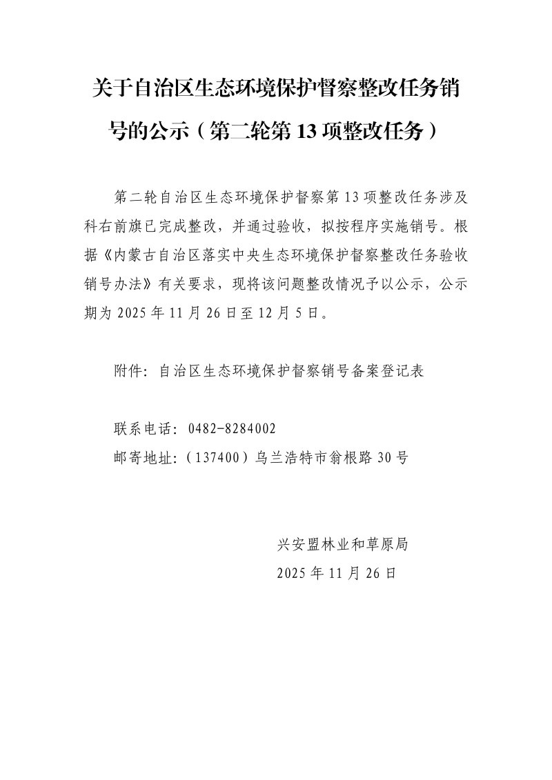 关于自治区生态环境保护督察整改任务销号的公示(第二轮第13项整改任务)