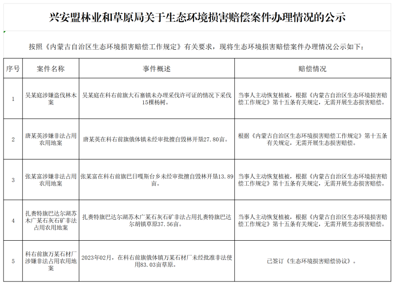 兴安盟林业和草原局关于生态环境损害赔偿案件办理情况的公示