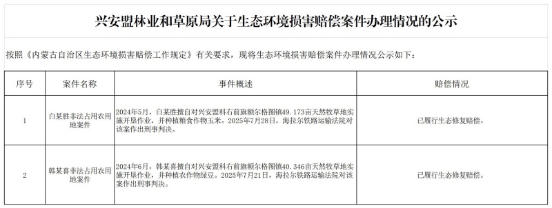 兴安盟林业和草原局关于生态环境损害赔偿案件办理情况的公示